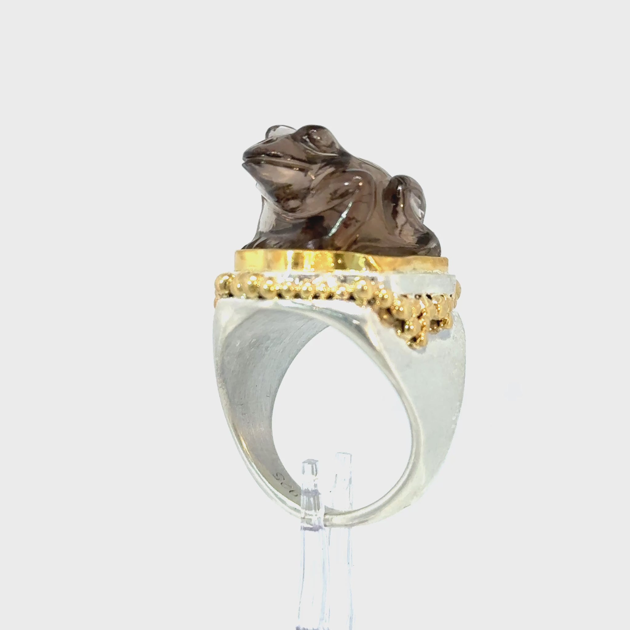 A piece to be noticed, a true cocktail ring. Frogs disappear for months and come back exactly when the world is ready for them — ancient, unhurried, and completely unbothered. This charming one is crouching, ready to jump, carved from smoky quartz.