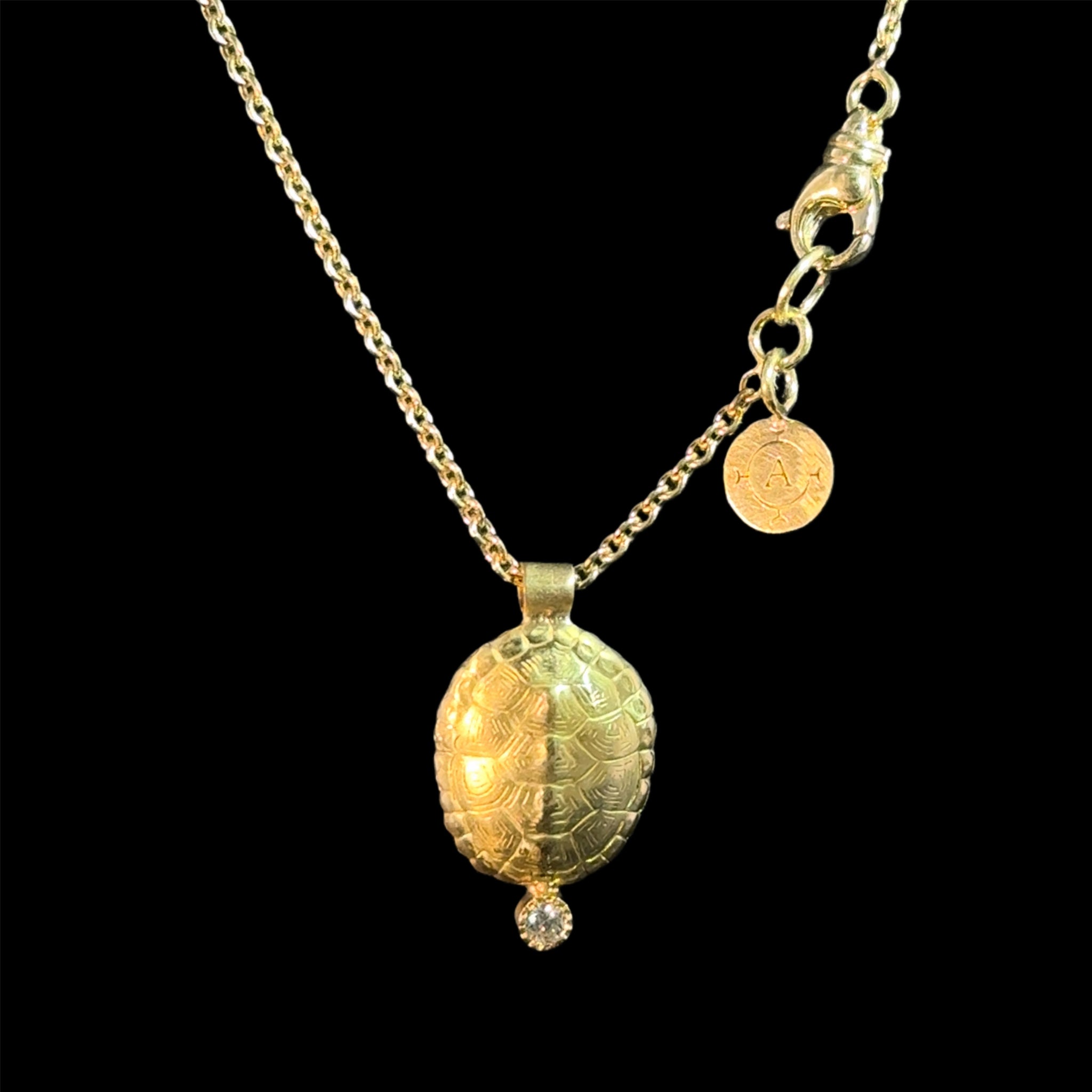 This golden tortoise is a detailed bas relief formed in 18k yellow gold and the details of the shell up the light beautifully in the 18k gold. The pendant is one inch by one-half of an inch, substantial enough to be seen, refined enough to wear every day. It hangs on the perfect weight 18k gold cable chain that is 16" long with a lobster clasp accented by an Ataumbi Metals charm. The easy-to-use clasp is decorative enough to wear at the front or slide to the side.